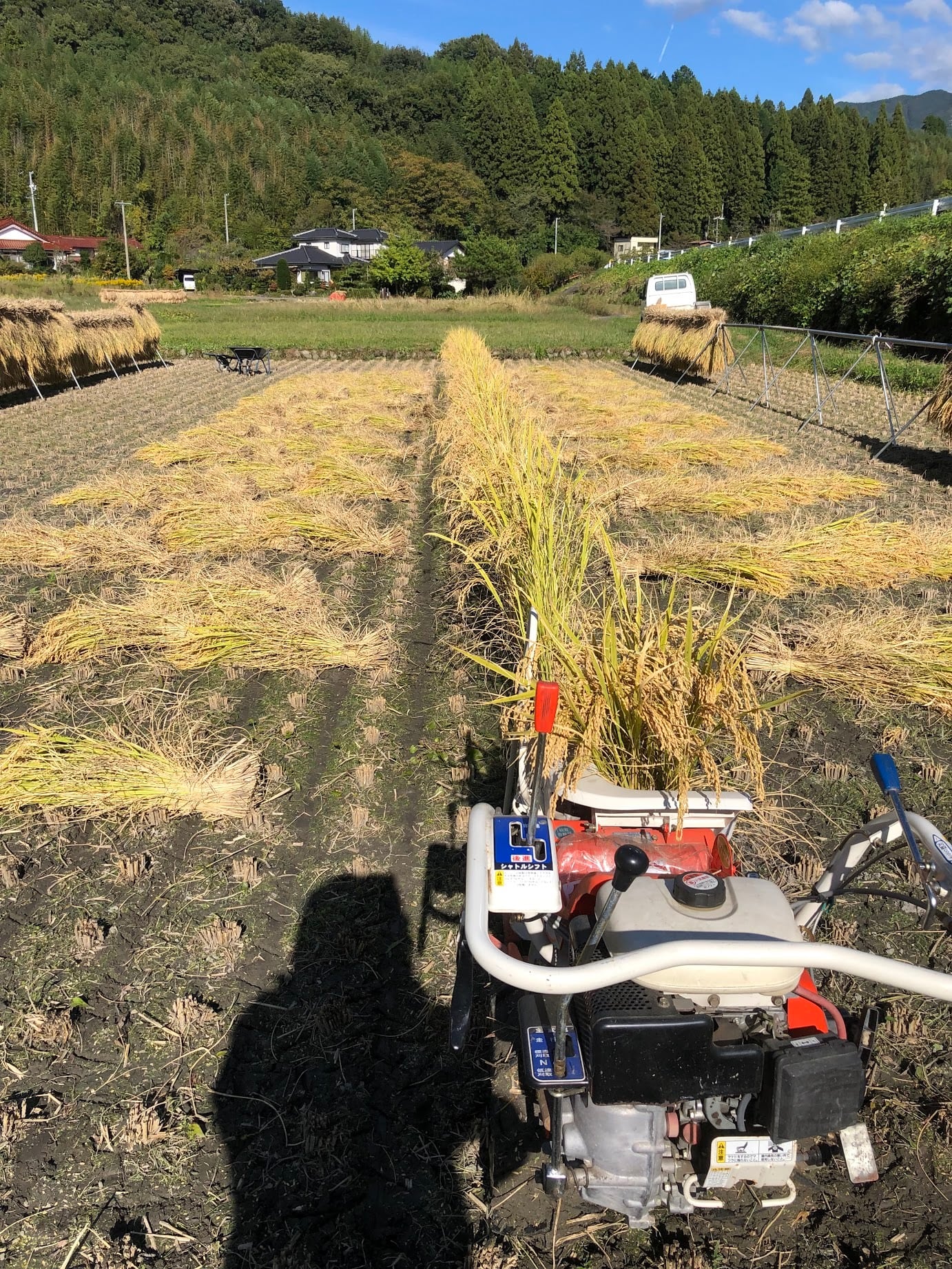 刈りった稲穂はハザに干して天日でゆっくり乾燥させ、脱穀・籾すりをしてようやく食べられるお米になります。
